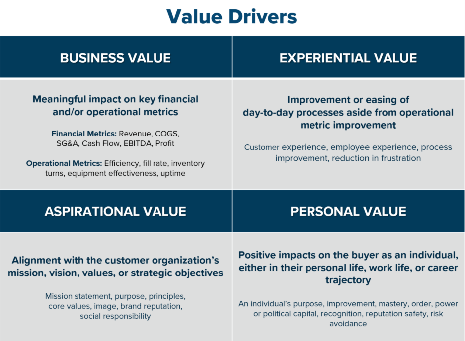 - Personal Value – Addresses the individual interests of a specific buyer, such as career advancement, recognition, or relief from personal workload challenges.