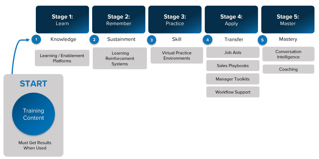 In this stage, you encourage the sellers to apply their newly acquired and practiced skills in the workplace with their buyers and customers. One would this happens naturally, but we know it often doesn’t. There are multiple ways to encourage it, including documenting action plans (setting the expectation), preparation worksheets (and reviewing them in advance), ride-alongs or call-alongs (live observation), and reviewing meeting recordings (and scheduling the review, so the seller knows the skill usage is expected and will be observed and coached). These actions will all support the application of what was learned in training.