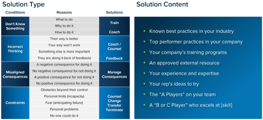 Note: Also identify the solution content (on the right in the above image), meaning the best practices or competencies needed to improve the skill and get the desired results. Delivering the right solution may take more time than a one-on-one allows. This is when you HAM-BAM or “Have a Meeting, Book a Meeting,” to dive deeper at a later time.