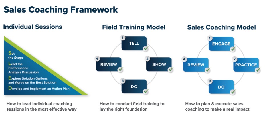 SCE offers a 4-step model for leading the coaching session (SLED), and then a model for field training (Tell, Show, Do, Review with Understanding Checks) and a model for coaching (Engage, Practice, Do, Review with Understanding Checks), and ongoing review cycles (Rolling Reviews). These models are designed to improve skills and systematically remove excuses for non-performance to foster behavior change and drive measurable outcomes through continuous improvement. SCE guides managers to be directive, when it’s required (if someone doesn’t know what, why, or how to do something well) and when to facilitate and guide, actively engaging the employee (if they know what, why, and how but just need to improve how well they do it). The field training and sales coaching models also purposefully involve role play or deliberate practice (in the Show and Practice steps), and the Understanding Checks remove all doubt about whether expectations are clear and understood, and whether the employee can do what they have been trained or coached.